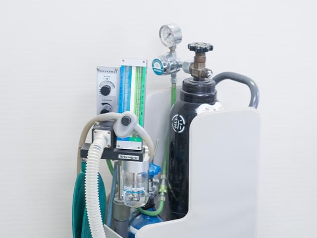 酸素に30%前後の濃度で笑気ガスを混入したガスを鼻用マスクから吸いながら治療をすることで、患者さんの気持ちをリラックスさせ、治療に対する恐怖心をやわらげます。治療終了後、笑気を止めて、100%濃度の酸素を吸うと笑気は数分で体内から完全に排泄されます。